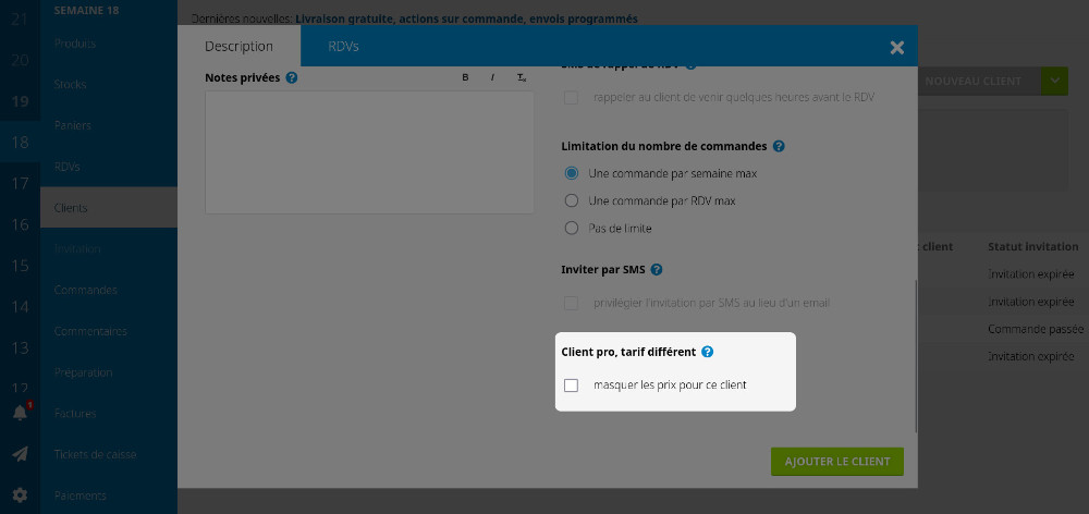 Si vous souhaitez prendre les commandes des pros via ciboulette, mais vous avez des tarifs très différents pour eux, vous pouvez cocher la case "masquer les prix" pour ces clients, et communiquez les prix séparément.