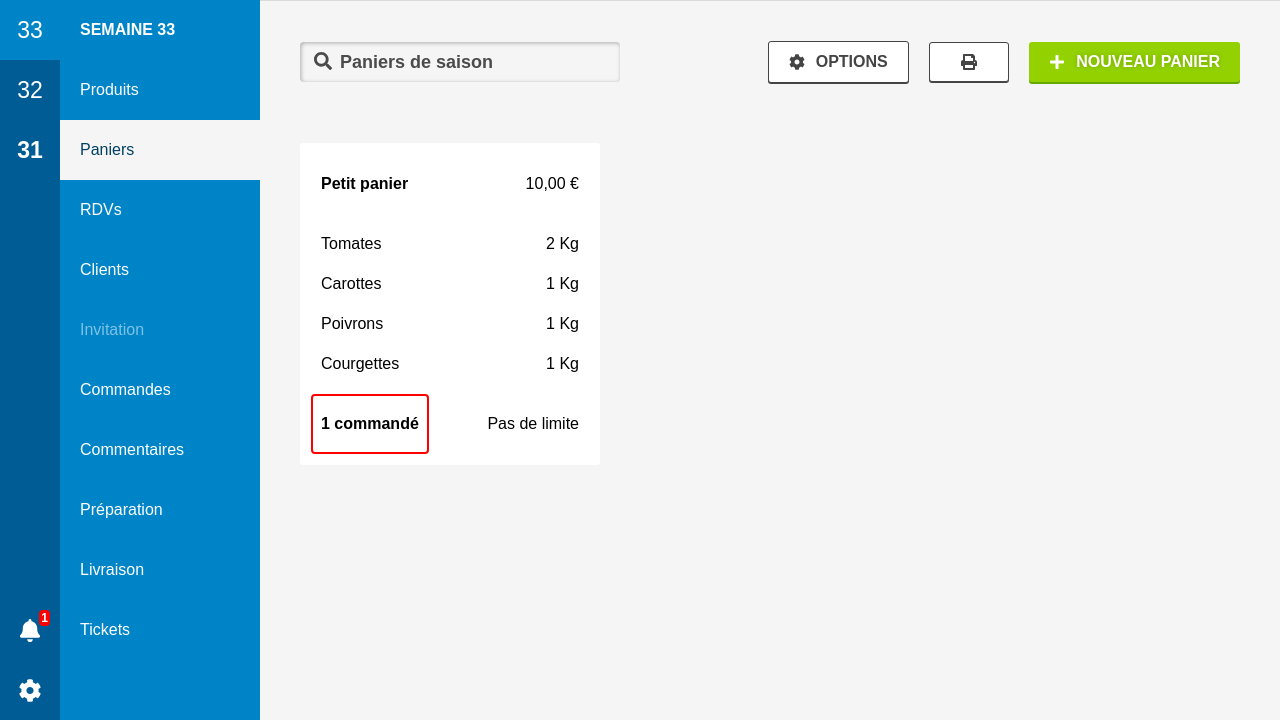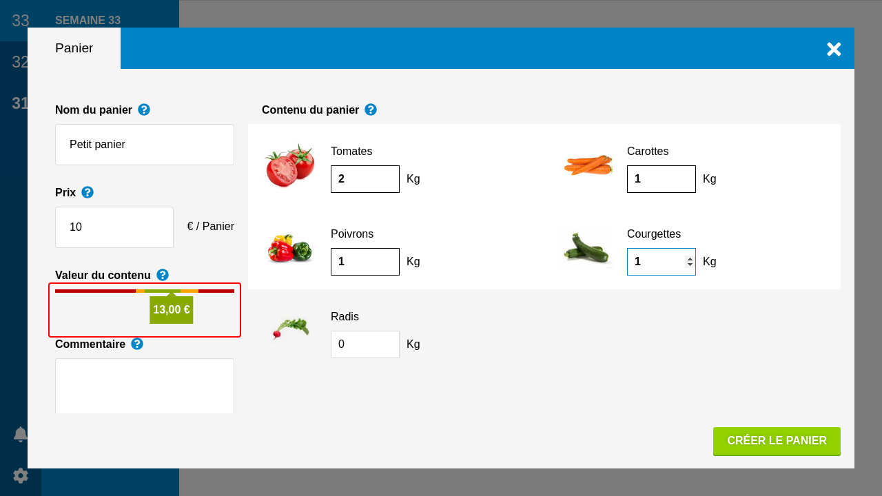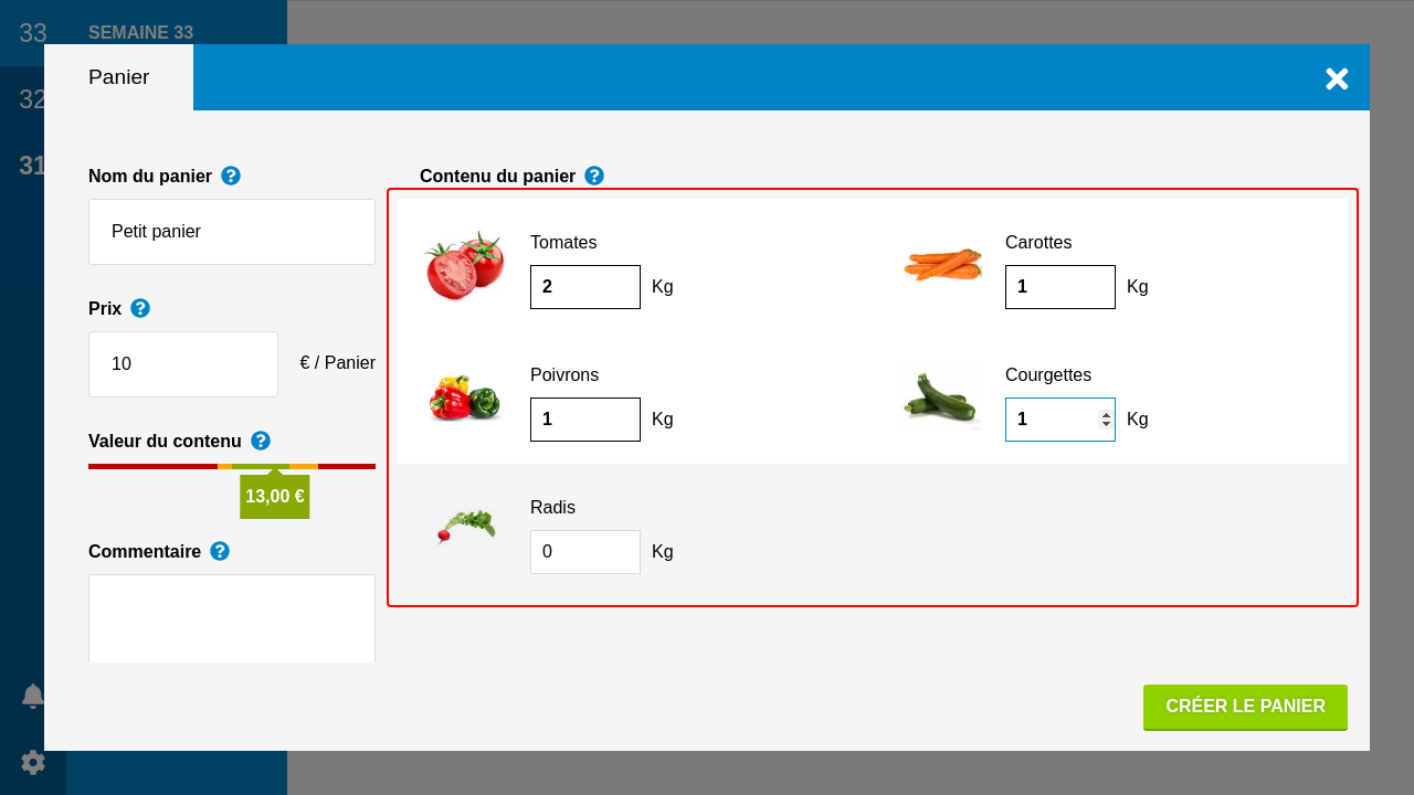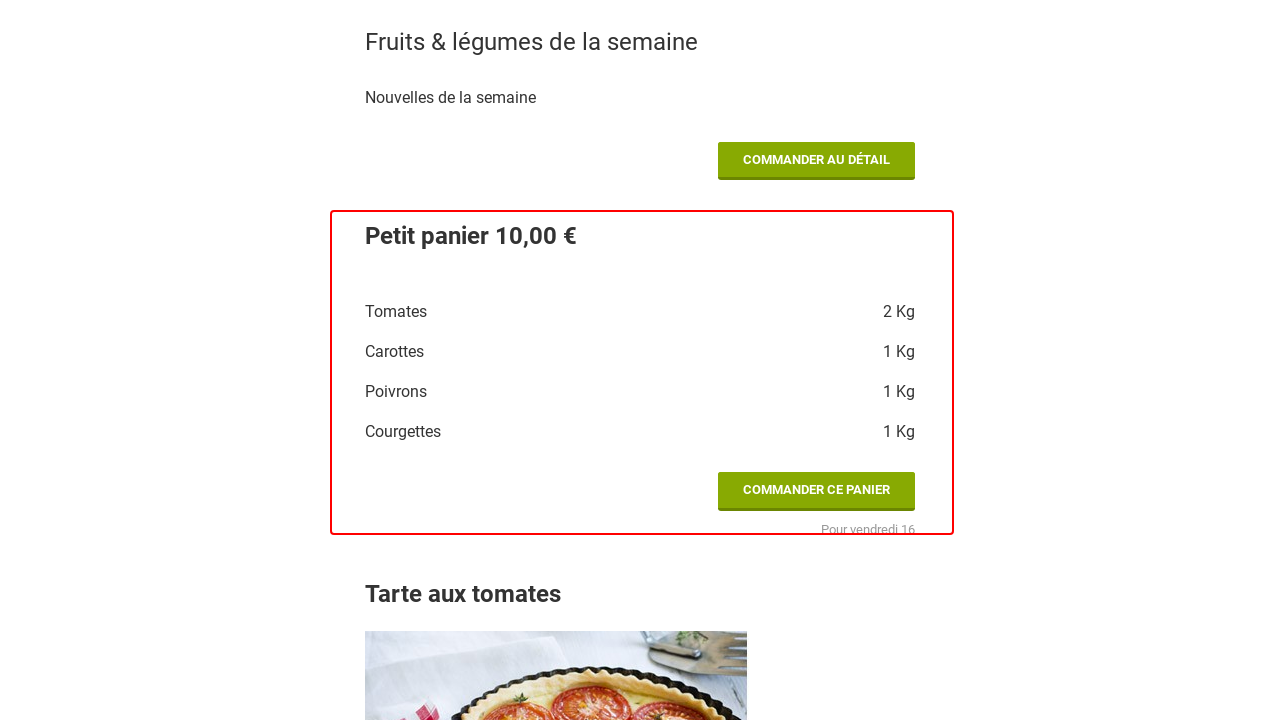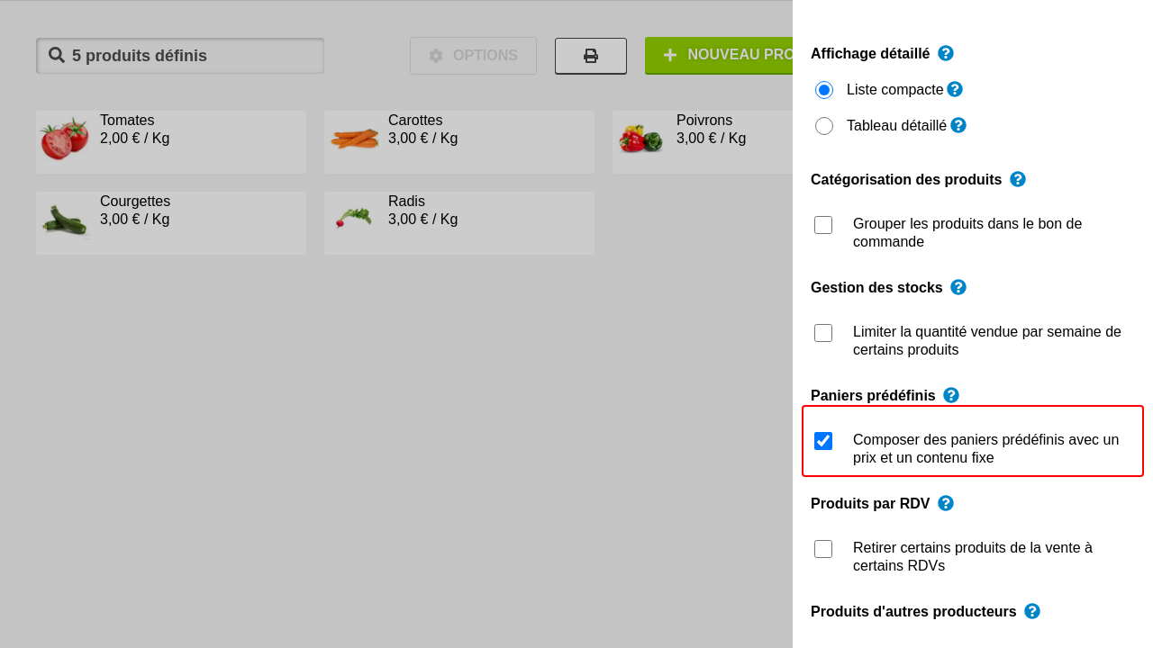 Elle vous permet de proposer un ou des paniers prédéfinis, constitués des produits déjà en vente au détail. Vous composez le panier et le logiciel calcule la valeur du contenu. Il calcule aussi les stocks disponibles. Par exemple, si votre panier de saison contient 1 kg de tomates, et que vous avez 6 kg de tomates en stock, le logiciel sait qu'il ne doit pas proposer plus de 6 paniers.