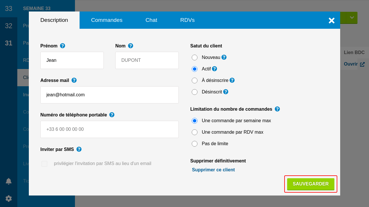 Vous pouvez forcer les commandes de certains rendez-vous à toujours contenir un panier prédéfini et éventuellement des produits additionnels au détail. Si vous activez l'option "Produits par RDV", vous pourrez interdire la vente de panier, ou la vente de produit au détail en fonction du rendez-vous.