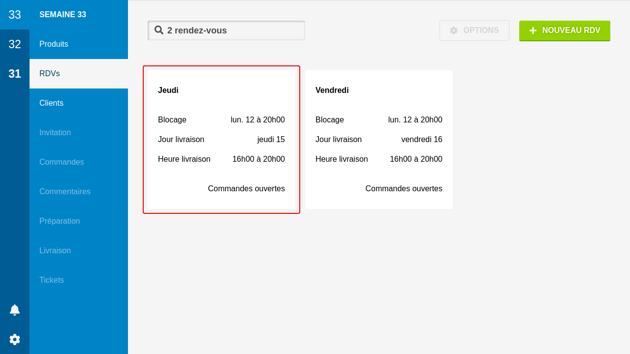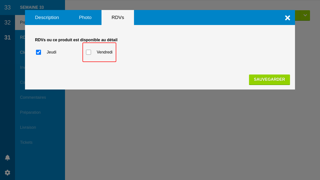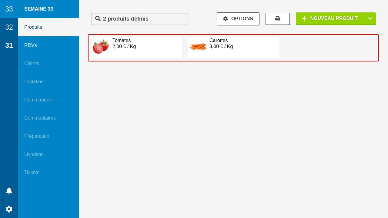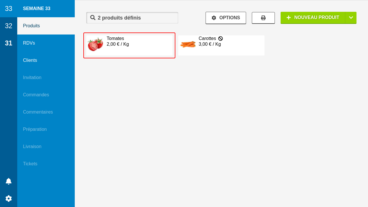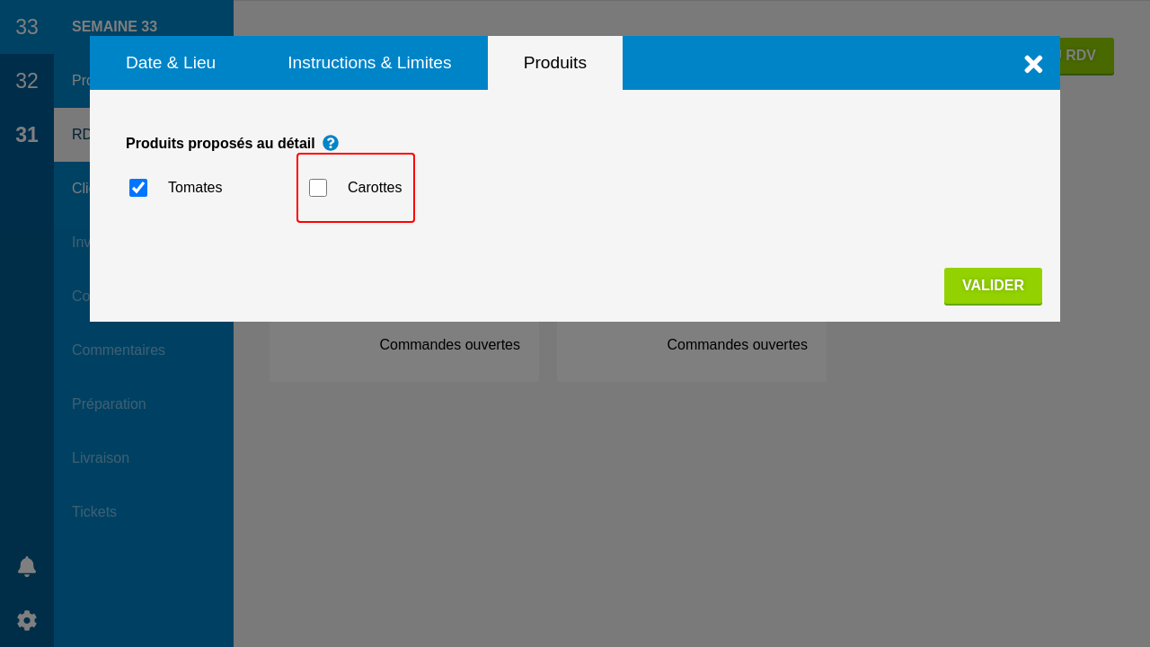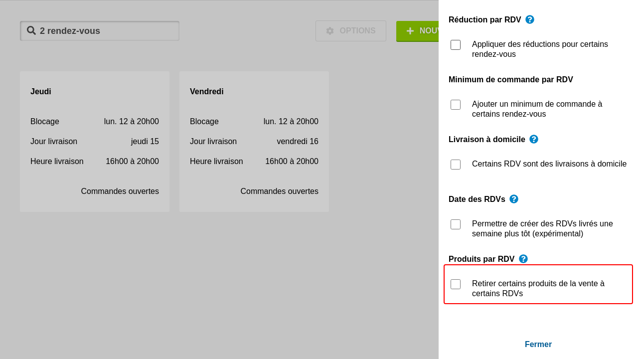 En activant l'option "Produits par RDV" vous pouvez limiter qui a accès à quels produits. Utile si vous proposez des produits réfrigérés et que certains points de dépôts n'ont pas de frigo, par exemple. Si les clientèles des RDV sont complètement différentes, vous pouvez aussi utiliser cette fonction pour proposer des produits à des prix différents, des paniers différents, etc.