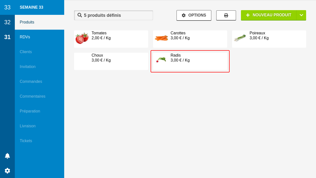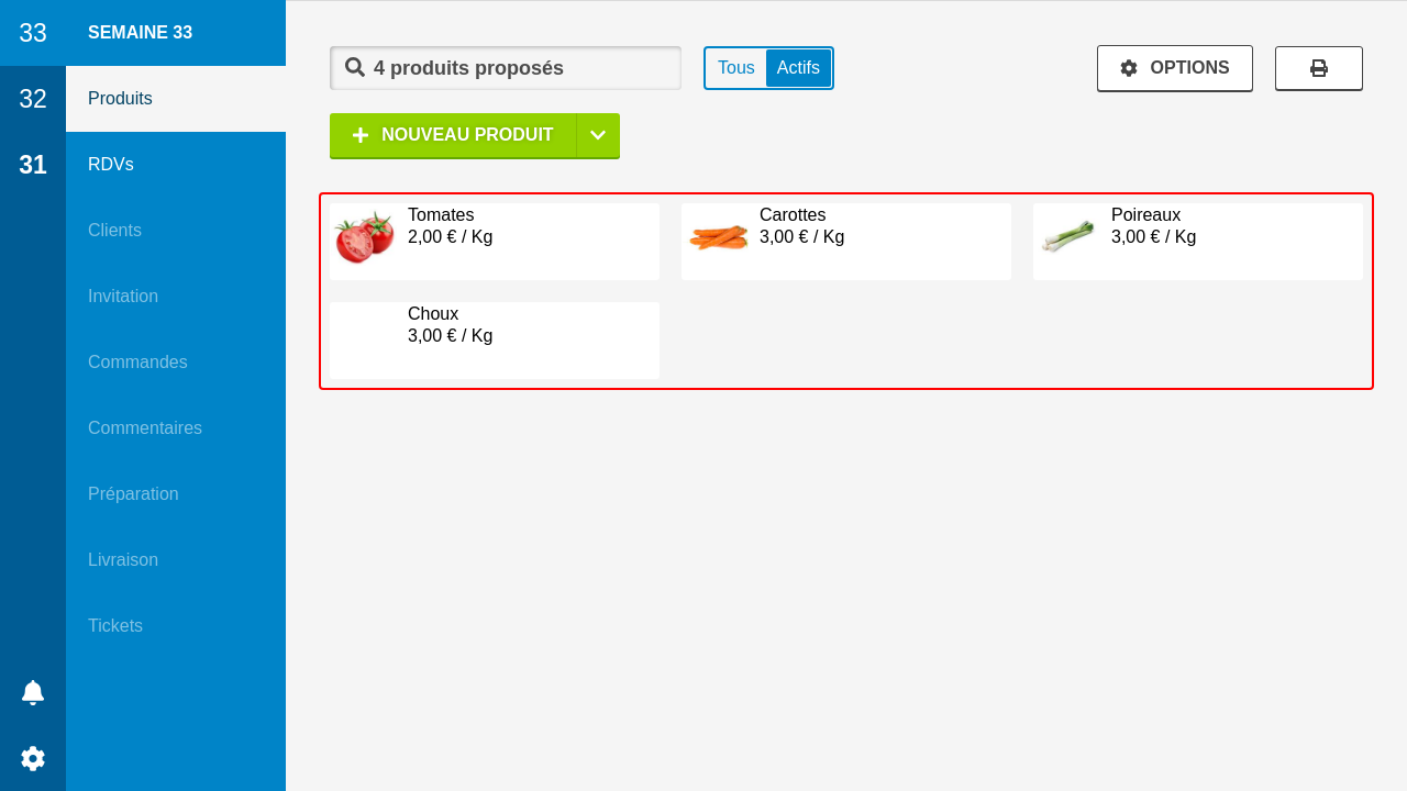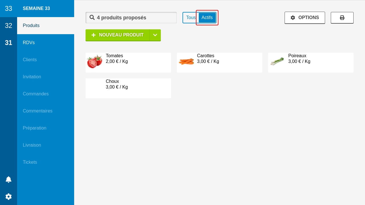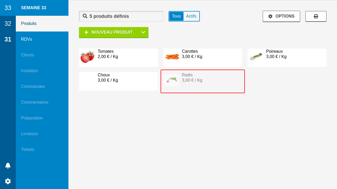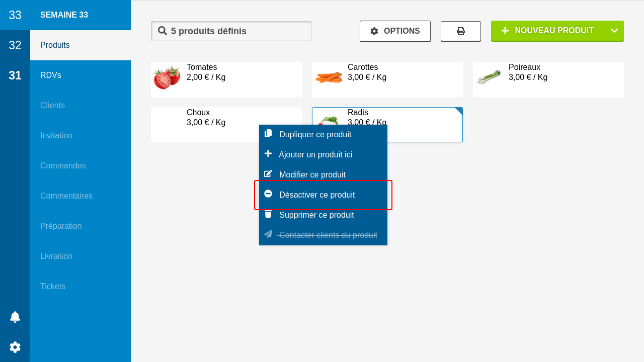 En début de saison, des nouveaux produits seront disponibles, que vous pouvez simplement ajouter au fur et à mesure. Quand un produit devient hors saison, vous avez trois choix : le supprimer, mettre le stock à zéro ou le désactiver.