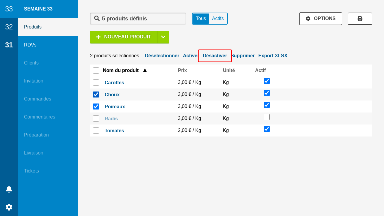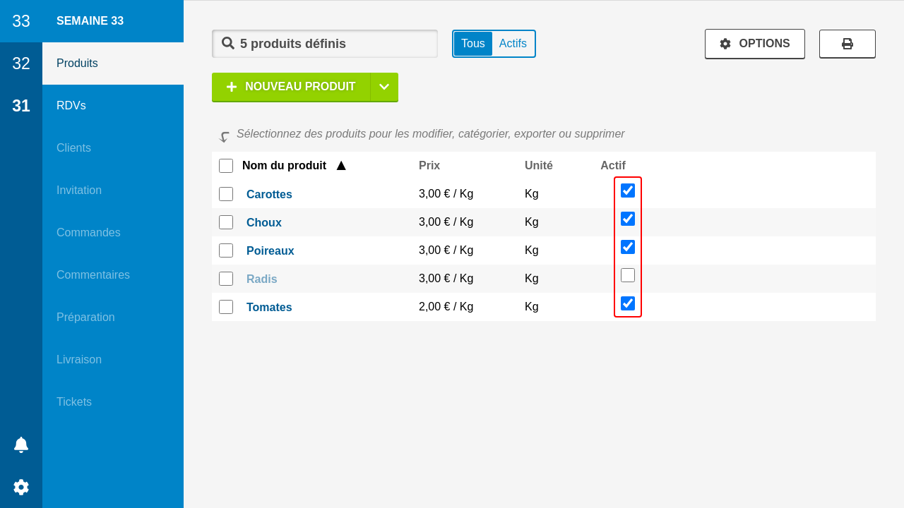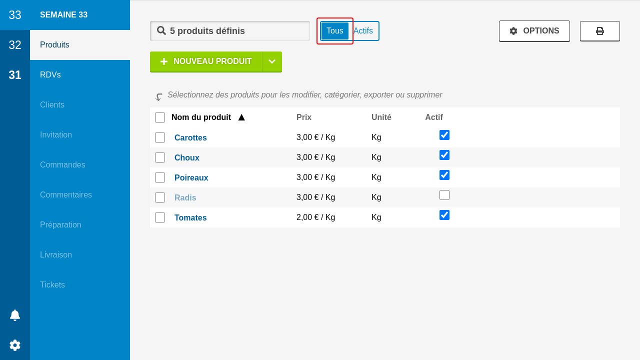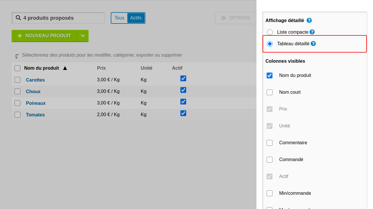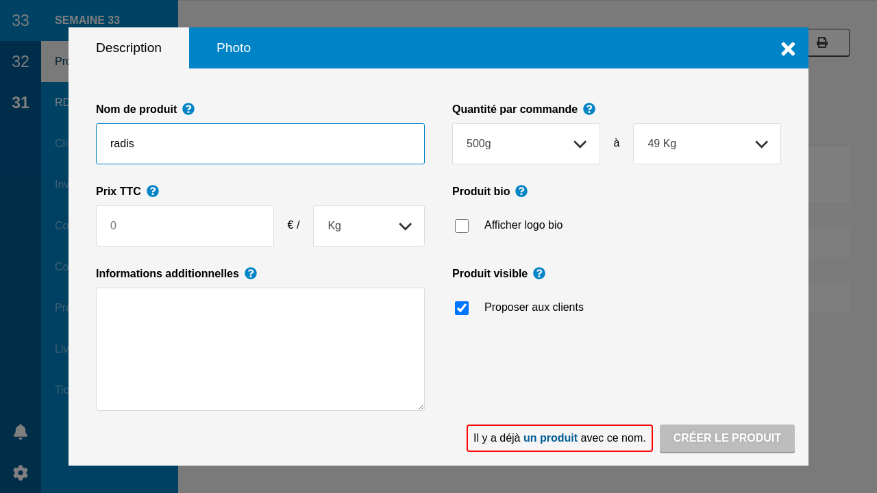 En début de saison, des nouveaux produits seront disponibles, que vous pouvez simplement ajouter au fur et à mesure. Quand un produit devient hors saison, vous avez trois choix : le supprimer, mettre le stock à zéro ou le désactiver.