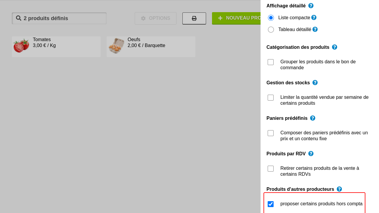 Vous avez le droit de proposer les produits de vos collègues à votre clientèle, et si vous ne faites que faciliter la transaction sans acheter puis revendre, vous n'avez pas à inclure ces ventes dans votre comptabilité (c'est à votre collègue de le faire). De la même manière, il ne serait pas logique que ciboulette demande 2% de ces ventes. C'est pourquoi une option spéciale existe pour ce cas d'usage. Les produits seront aussi exclus des paiements en ligne, du minimum de commande et de minimum à atteindre pour la livraison gratuite.