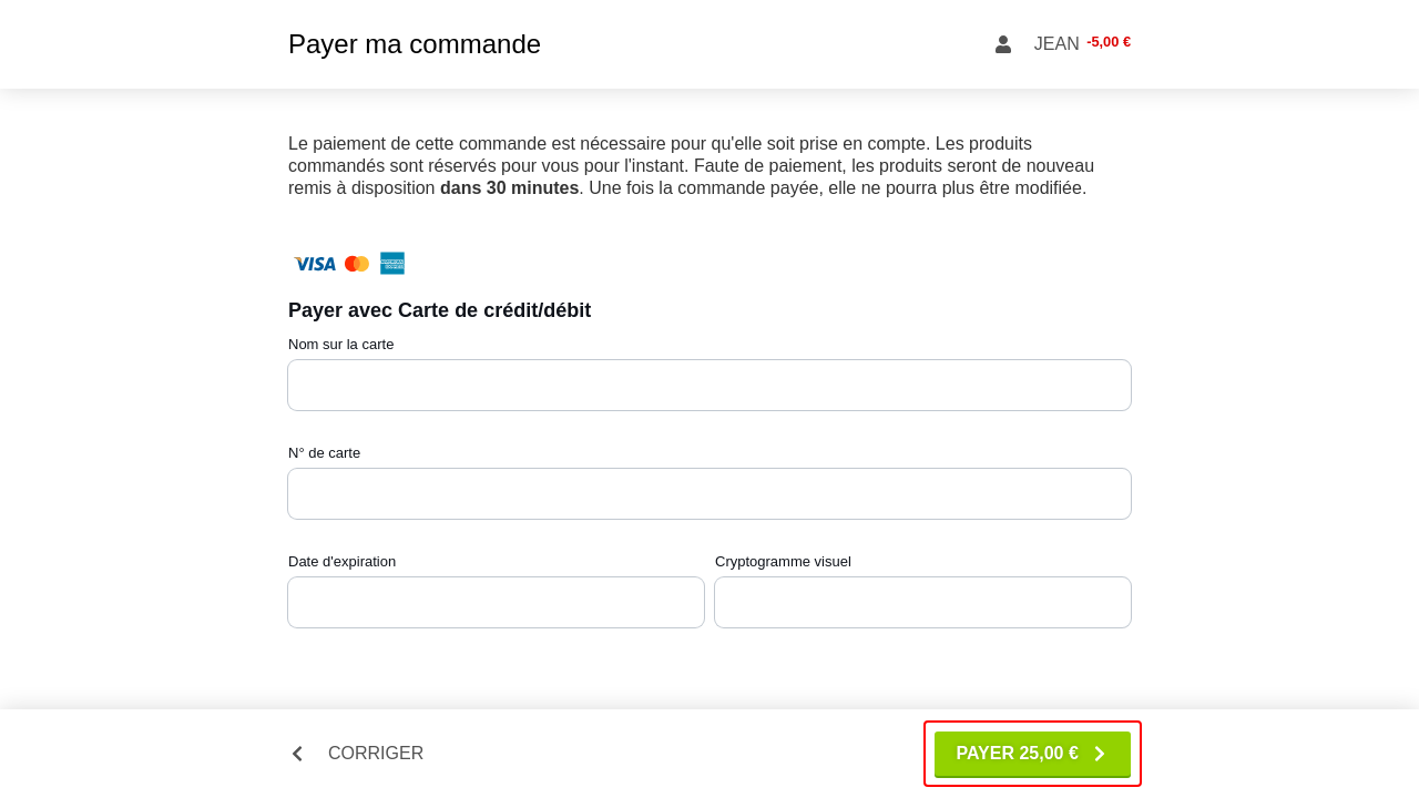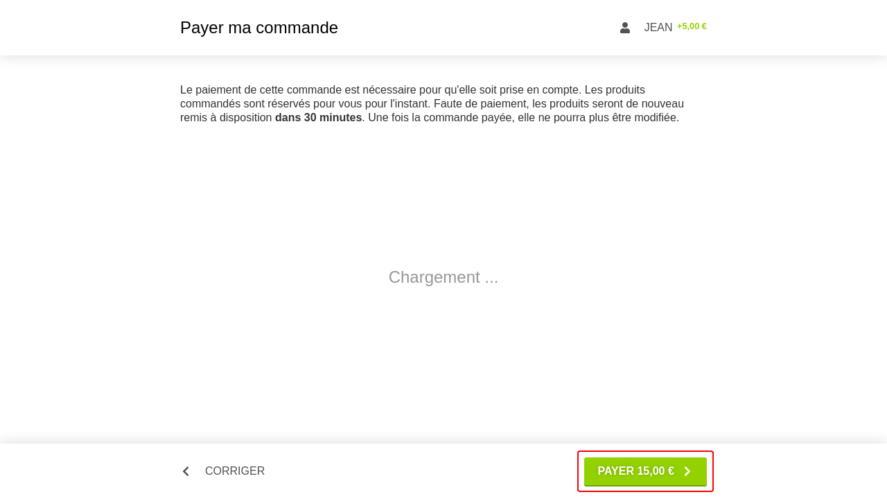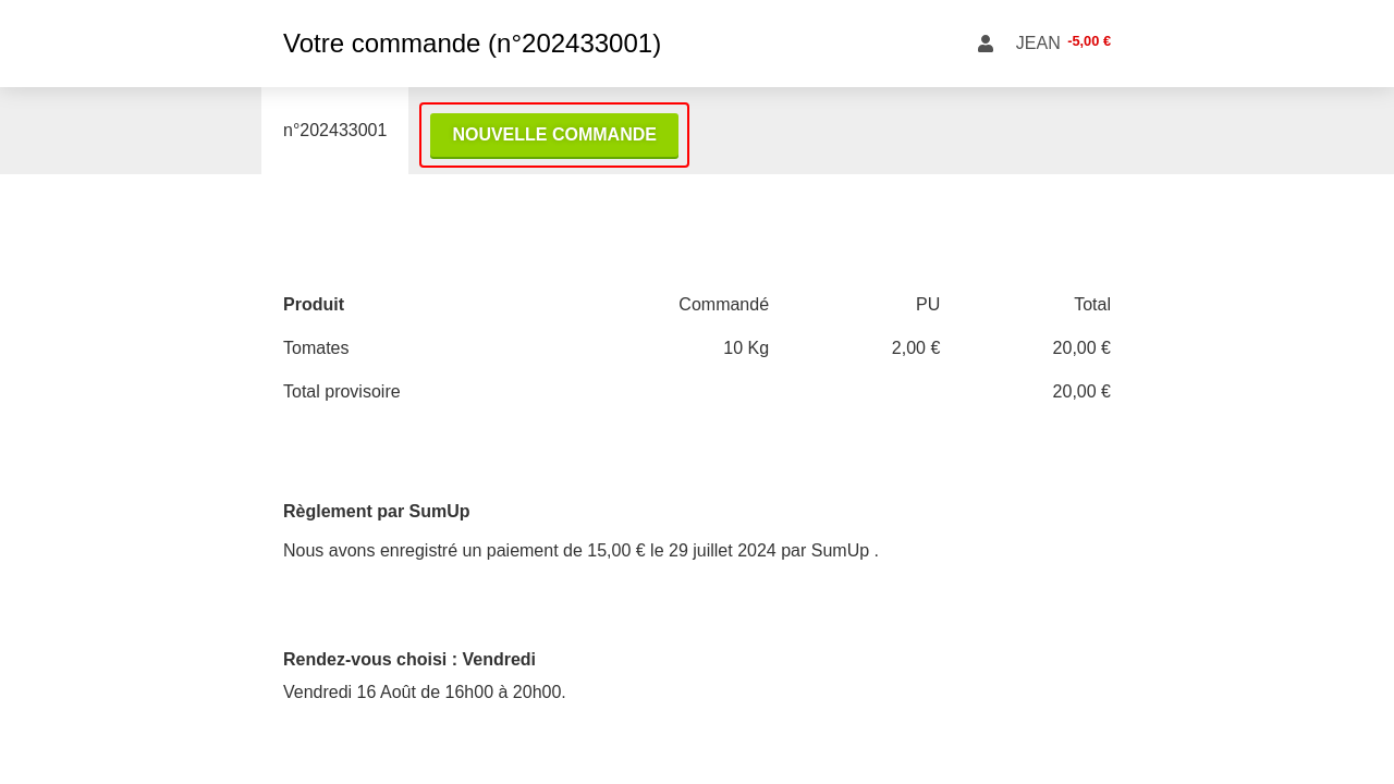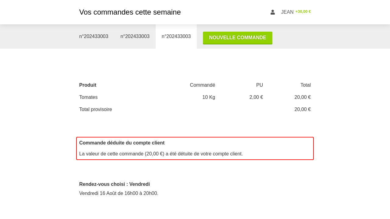 Je commence par rendre le paiment obligatoire. Mettons que je commande 20€ de tomates, en tant que client, avec une balance positive de 5 €. L'application ne demande alors que 15€, la balance positive du client est déduite du total. La commande est passée, et elle est comptée dans la balance. J'enregistre un débit de 5 €. Et je l'autorise à commander plusieurs fois pour nos tests. Le client a le droit de commander plusieurs fois, donc cliquons sur "NOUVELLE COMMANDE" Je vais passer de nouveau une commande à 20 € Cette fois-ci, les 5€ dus sont ajoutés au montant de la commande. Enfin, voyons le cas où la balance du client couvre totalement le montant. J'enregistre un crédit de 50 €. Je vais passer une dernière commande à 20 € La commande est immédiatement acceptée. Par contre, elle est déduite du compte client, pour éviter de pouvoir passer plusieurs commandes pour la même balance positive.