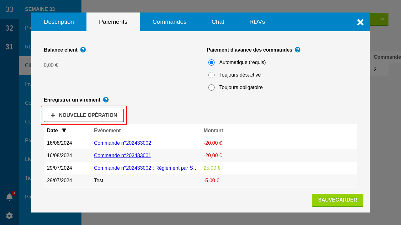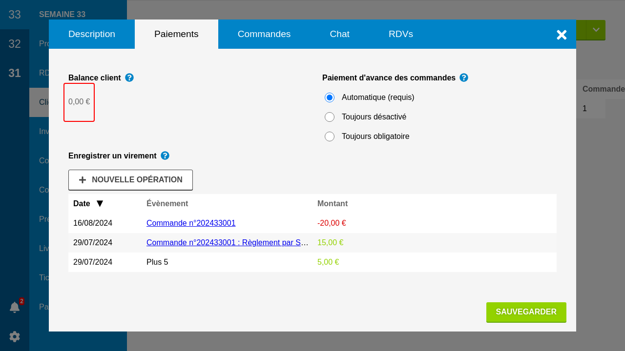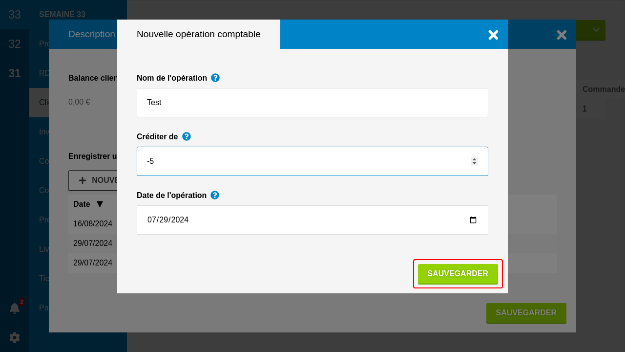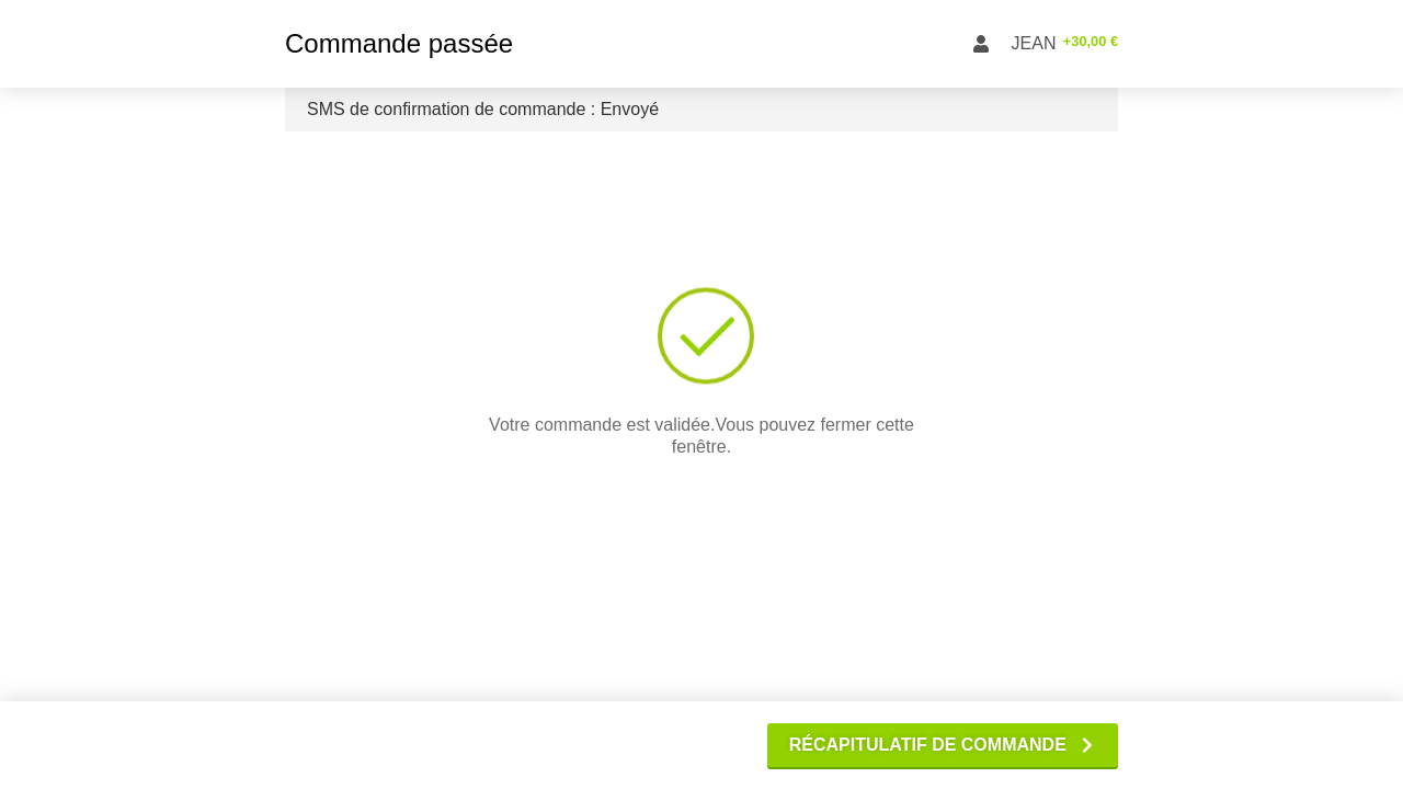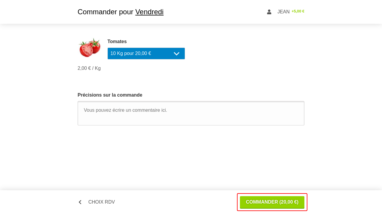 Je commence par rendre le paiment obligatoire. Mettons que je commande 20€ de tomates, en tant que client, avec une balance positive de 5 €. L'application ne demande alors que 15€, la balance positive du client est déduite du total. La commande est passée, et elle est comptée dans la balance. J'enregistre un débit de 5 €. Et je l'autorise à commander plusieurs fois pour nos tests. Le client a le droit de commander plusieurs fois, donc cliquons sur "NOUVELLE COMMANDE" Je vais passer de nouveau une commande à 20 € Cette fois-ci, les 5€ dus sont ajoutés au montant de la commande. Enfin, voyons le cas où la balance du client couvre totalement le montant. J'enregistre un crédit de 50 €. Je vais passer une dernière commande à 20 € La commande est immédiatement acceptée. Par contre, elle est déduite du compte client, pour éviter de pouvoir passer plusieurs commandes pour la même balance positive.