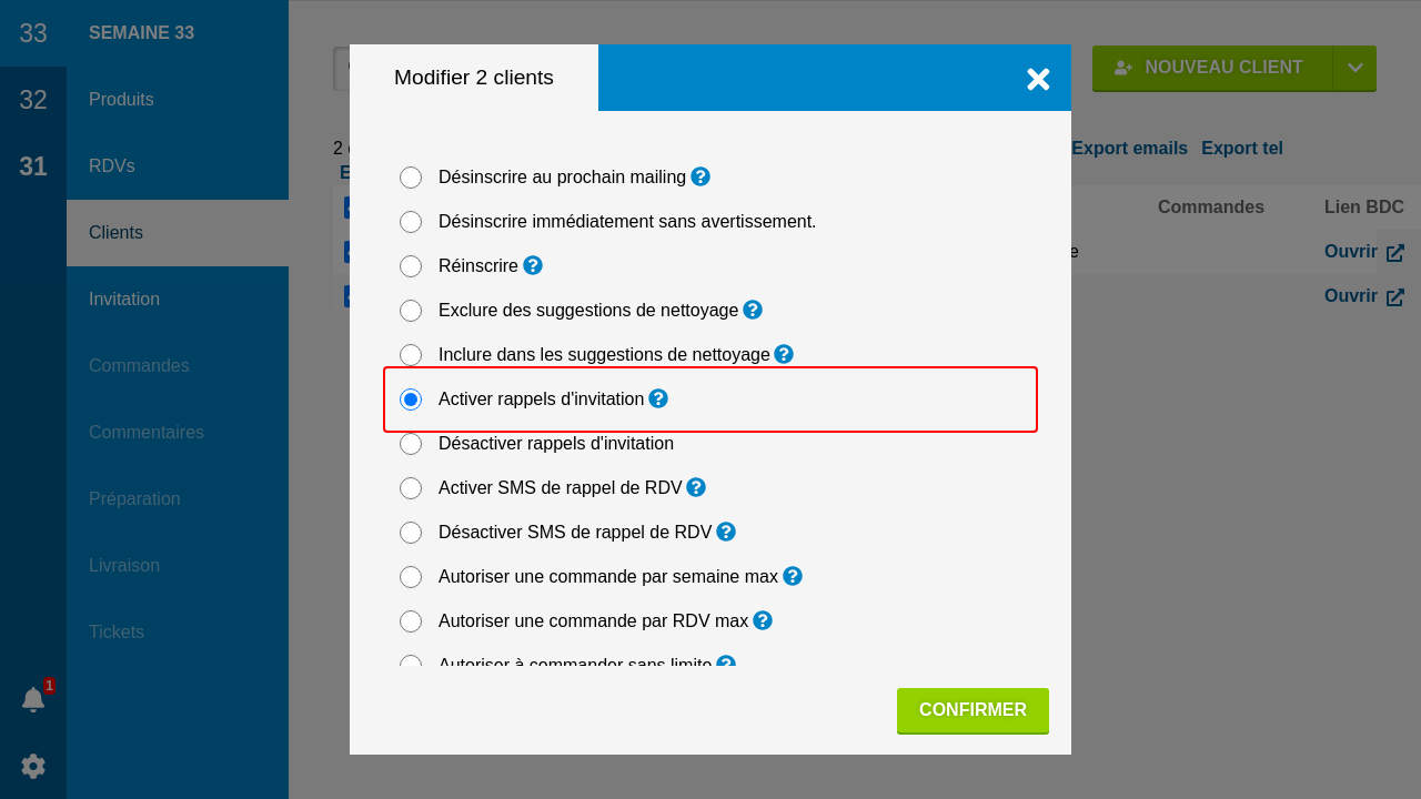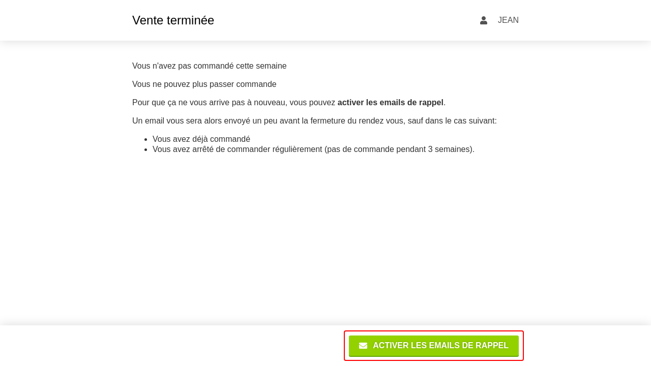 Quand un client arrive trop tard pour commander, un bouton lui propose d'activer les e-mails de rappel. Ça permet d'envoyer une deuxième invitation, par e-mail, dans le cas où la première a été ignorée.