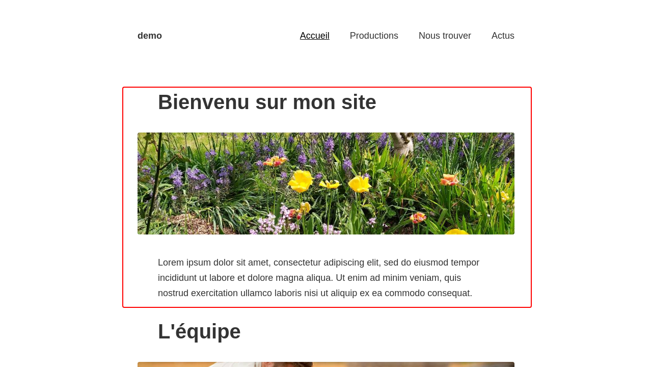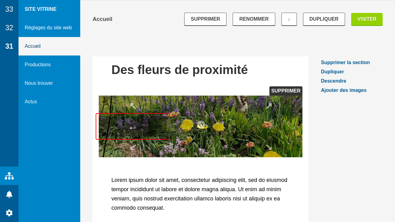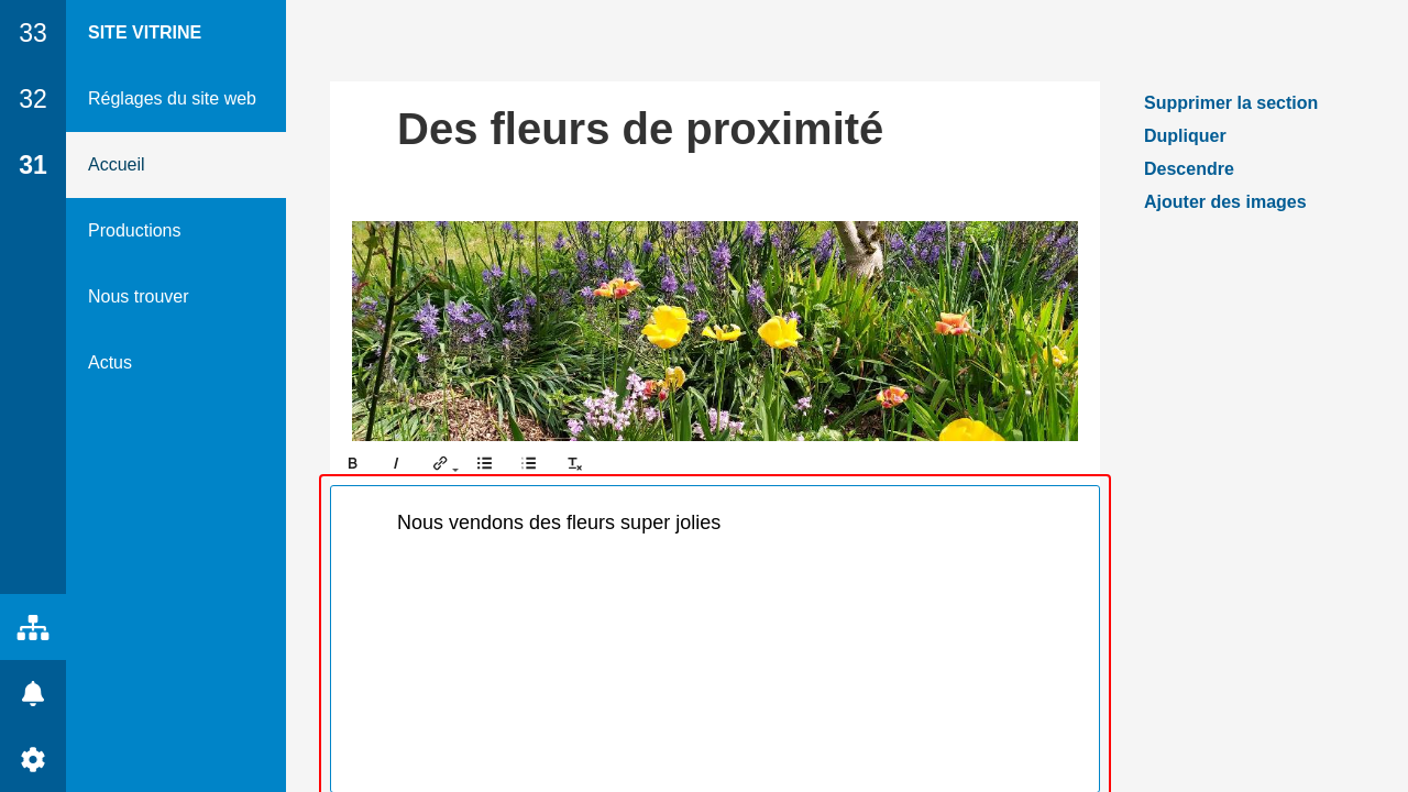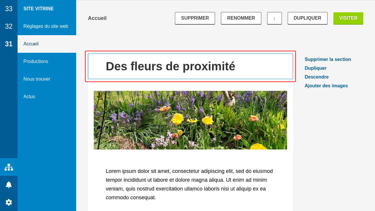 La page est ensuite constituée de sections, chacune avec un titre, une ou des photos et un texte. Tout est optionnel, il n'est pas nécessaire d'avoir systématiquement