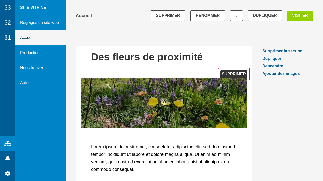Si vous avez un logo, alors vous pouvez choisir un titre un peu plus long avec plus de mots-clés pour Google. Choisissez l'adresse du site, avec si possible les mots-clés les plus importants sans être trop long. Chaque ligne ici représente un lien du pied de page. À gauche, il s'agit du texte visible du lien. À droite, l'adresse du lien. Une adresse mailto:xxx@xxx.xx permet d'ouvrir le logiciel de messagerie du client lorsqu'il clique sur le lien. Un lien tel est pour recevoir des appels. Ajoutez de préférence le préfixe de pays. Bien sûr, vous pouvez ajouter un lien vers un site web. L'adresse doit alors commencer par http ou https. S'il n'y a pas d'adresse de lien, alors le bloc sera simplement affiché comme du texte. Pour modifier le titre d'une section, il suffit de cliquer dessus. Pour retirer une photo, on peut cliquer sur "supprimer" au-dessus. Les images sont recardées en petit selon la taille de l'écran du visiteur.